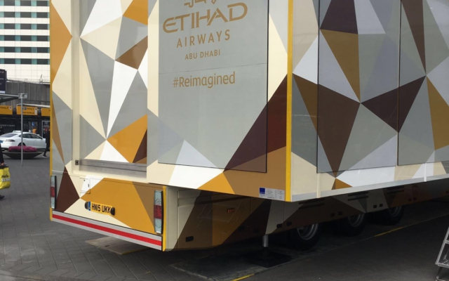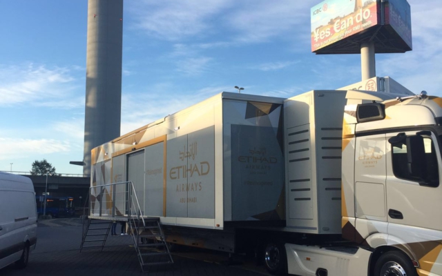 Een brutale actie van Etihad, een van de opkomende concurrenten van de KLM. De maatschappij is op Schiphol Plaza, zeg maar het blauwe hart van de KLM neergestreken om passagiers de ogen uit te steken met de luxe en service aan boord.